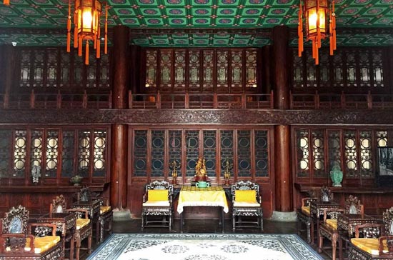 在表面,恭王府是守规矩的:绿色的琉璃瓦,三路五进的格局,门钉、屋脊、房子开间数等,完全符合《大清会典》的规定。
